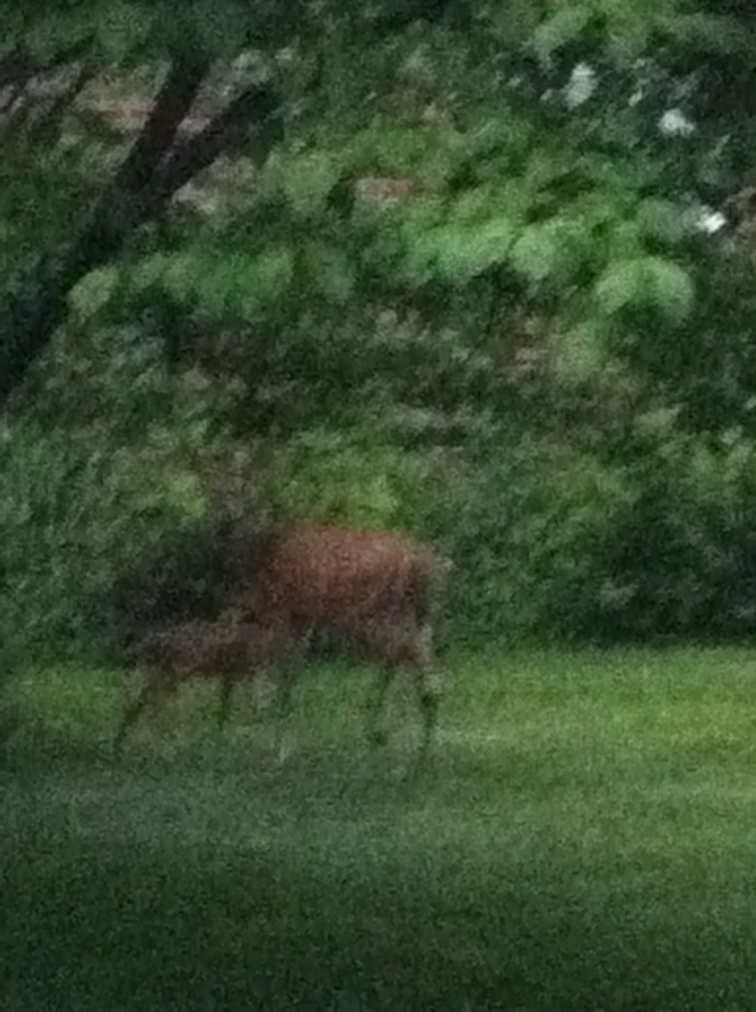 Then, I went out at about 7 pm and she was gone. Partly relieved and partly concerned, I set off down the street in case she was wobbling along alone on her own four feet. About a half a block down the street, I thought I glimpsed a full sized deer and proceeded quietly until I noticed that, sure enough, there was Momma, with the baby right beside her. What a beautiful sight! The mother had returned, collected her baby, they were on their way home. All was right with the world.